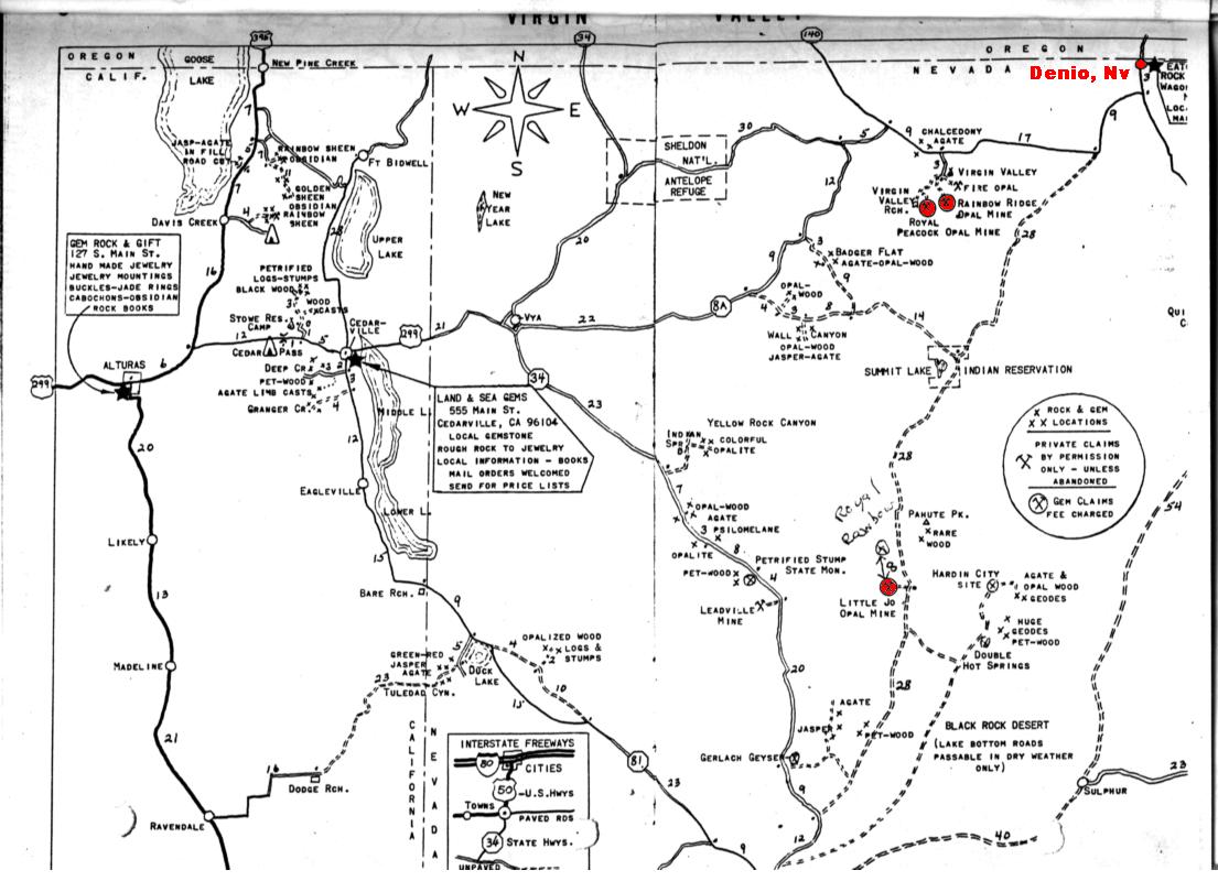 Alturas, CA to Denio, NV. Shows access roads, collection sites for many